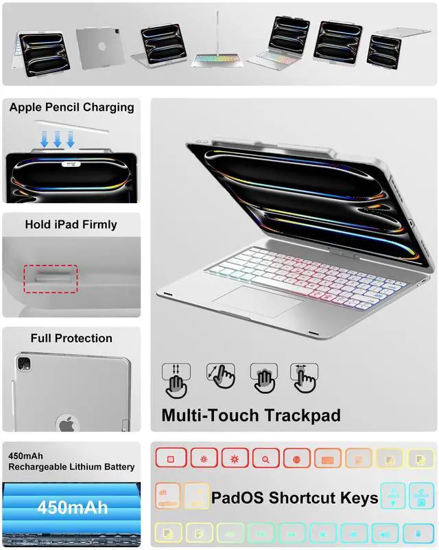 iPad Pro 13 inch Case 2024 with Keyboard (M4), iPad Pro 13 inch case with Apple Pen Holder, Multi-touch Trackpad, 360° Rotarable, Bluetooth Keyboard, 7 Colors Backlit, Auto Sleep/Wake, Support Pen Charging for iPad Pro 13 inch (M4) A2925/A2926/A3007 Silver