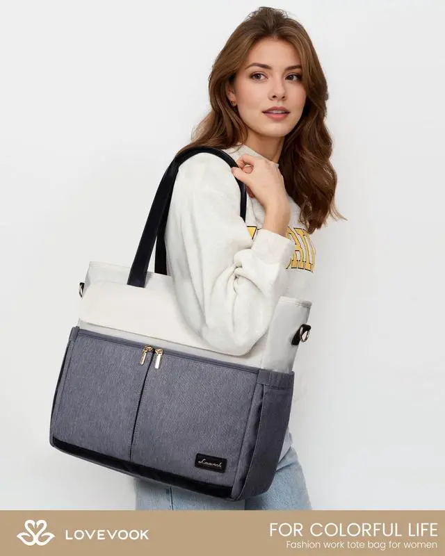 LOVEVOOK Laptop Bag for Women 15.6 Inch Canvas Laptop Large Capacity Work Bags Mutiple Pockets Teacher Bag Water Resistant Computer Bags for Business Travel Nurse, Gray Beige