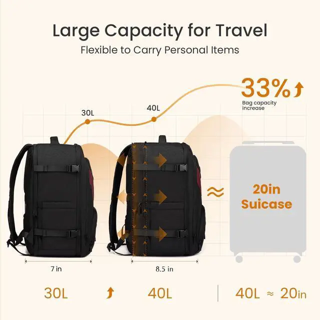 40L Expandable Large CapacityTravel backpack for men women with expandable design,backpack for travel giving you flexible large capacity from 30L to 40L.Carry on backpack has 3 large compartment for your ipad,laptop,clothes and travel essentials.