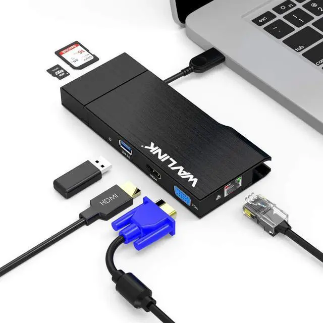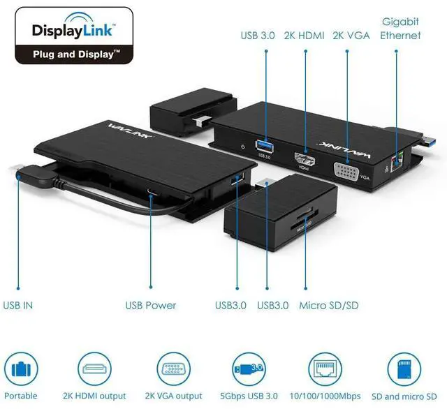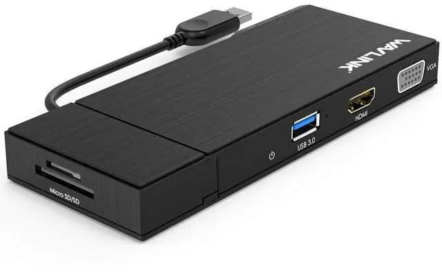Wavlink Universial USB 3.0 Dual-Head Mini Docking Multi-Display HDMI/VGA with Gigabit Ethernet, USB 3.0 Port, Removable Card Reader, HDMI up to 2560x1440 and VGA 1920x1200 Supports Windows