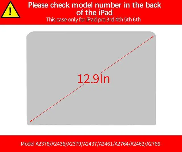 WARNINGThis case is NOT compatible with other model iPads. Only For iPad Pro 12.9 Inch 2022(6th Gen)/2021(5th Gen)