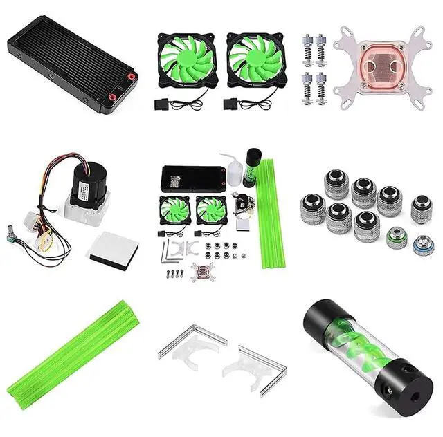 Complete Water Cooling KitAll included240mm black heat sink+2pcs green LED fans+CPU water cooling block+Sine Quiet +Cylindrical water reservoir with spiral belt+6 pcs PETG 50cm green hard tube+6 pcs Two-Touch Fitting.