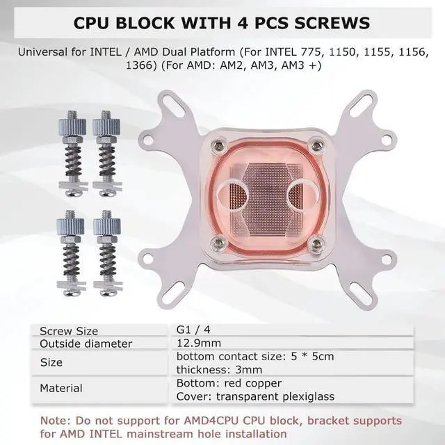Universal Water Cooling BlockThe CPU water cooling block made of red copper and transparent plexiglass,support for INTEL/AMD (for 775,1150,1155,1156,1366)(for AM2, AM3, AM3 +).