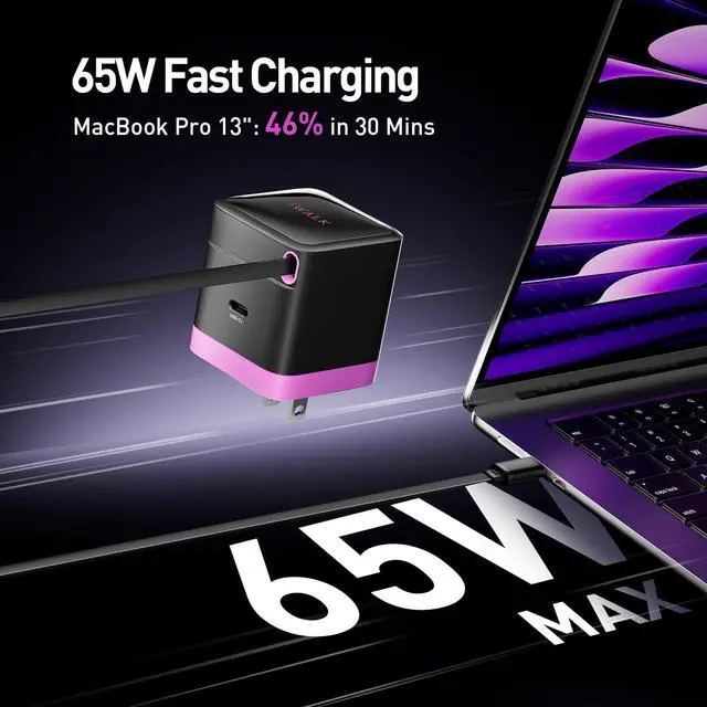65W Max Leopard Reel: Quickly powers laptops, tablets, and phones. Charges a MacBook Pro 13" to 46% in just 30 minutes.