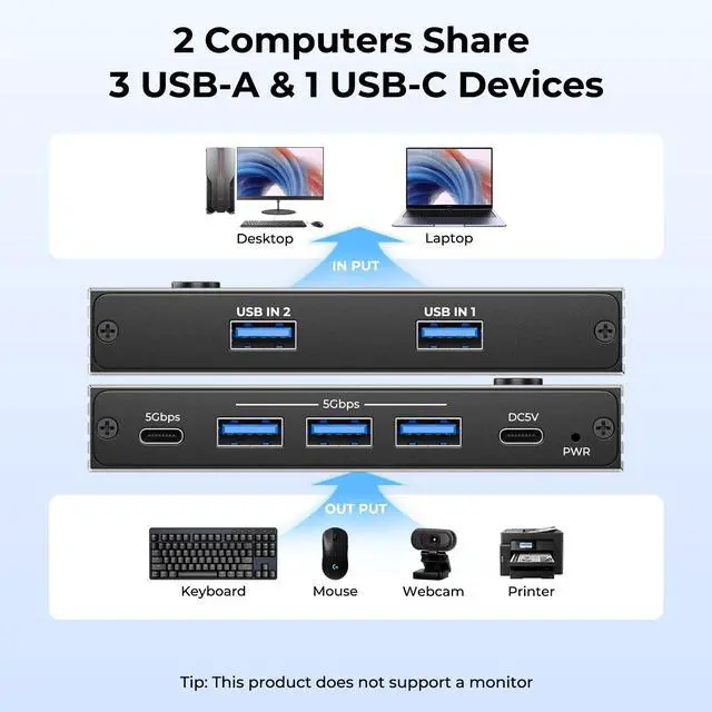 USB Switch 2 Computers: DUOPURUI 2-in-4-out USB switcher supports switching 2 computers sharing 4 USB devices (such as keyboards, mouse, printers, headphones, hard disk and Webcam). Switch between office computers and personal computers using a single set of keyboard and mouse. No need to manually plug and unplug your USB devices each time (Note: This is a pure USB switch, and does not support video transmission or monitor switching)