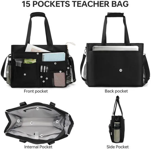 PREMIUM MATERIAL: The teacher tote bag is made of polyester with encrypted stitch, which is water-resistant and scratch-resistant. The bottom provides protection and supports weight. Smooth zipper & magic paste pocket make this tote bag using freely