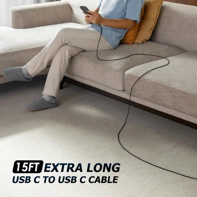 Upgraded Durability Long USB C Cable: This USB C long cable 15 ft enhances its elasticity while being reinforced, after more than 30000 bending tests, the USB C to USB C Cable has achieved durability upgrades, preventing cable bursts, and providing additional protection. It's a braided cable with very well constructed USB C connectors.