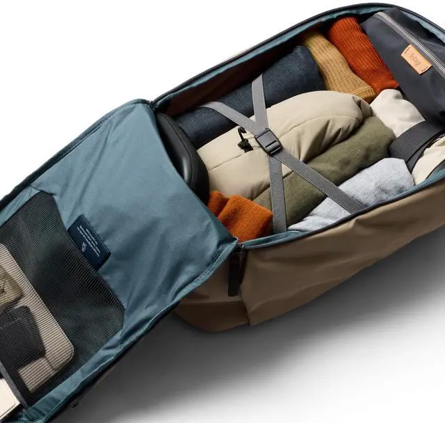 The large laptop pocket fits 16 devices. The zippable side pockets fit a water bottle plus go-to essentials. The top storage zone has room for a Tech Kit or Toiletry Kit, and the front pocket fits A4 documents or an iPad.