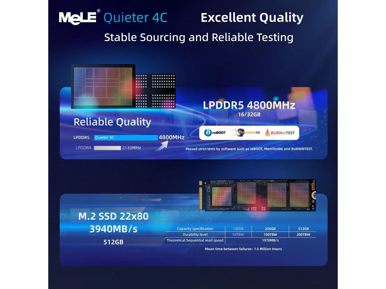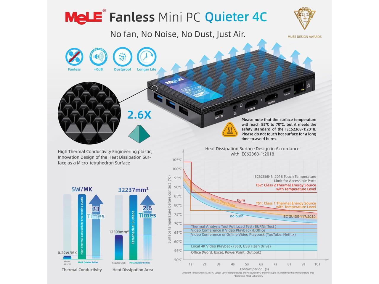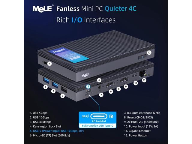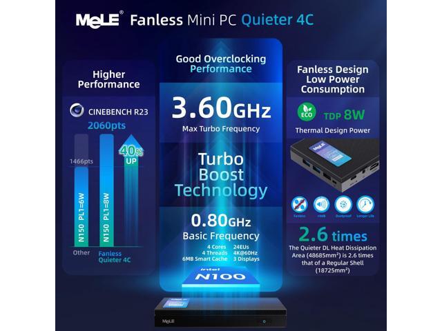 MeLE Quieter4C Fanless Mini PC 32GB RAM 512GB Storage Micro PC Twin Lake N150(up to 3.6GHz) USB-C 2 X HDMI 4K@60 Triple Display Small Form Factor Desktop Computers with VESA Mount for Home/Office