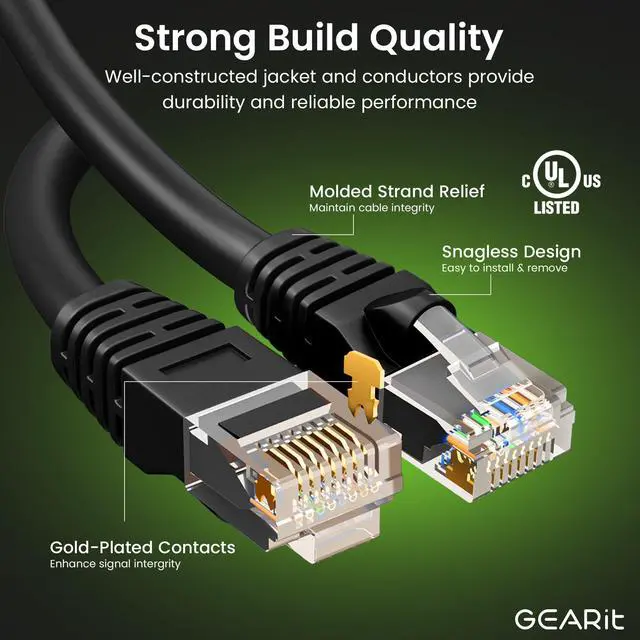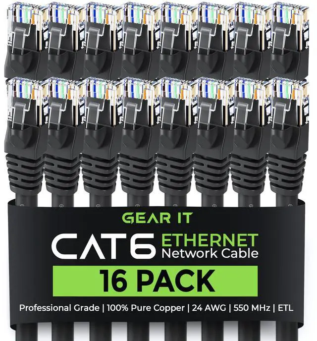 High-Performance Cat 6 Ethernet Cable Pack GEARit's 16-pack of 1 ft Cat6 ethernet patch cables features 24 AWG UTP stranded conductors twisted in an X-structure spline to minimize crosstalk and deliver full 10 Gbps bandwidth - future-proof network cables for home, office, data-center, and server use.