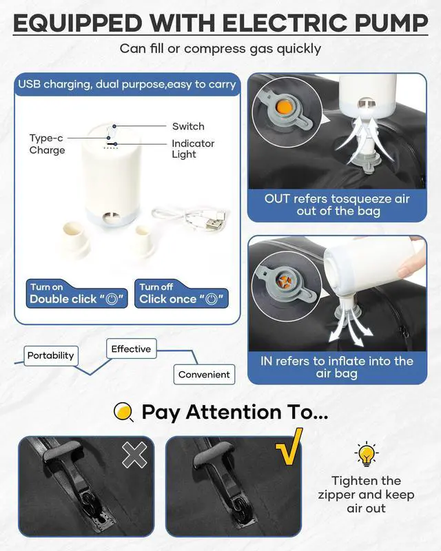 Compressing Space: This vacuum travel backpack is equipped with an electric pump to quickly extract air. First, zipper up the zipper after putting the clothes into the pocket; second, double-click the power button of the electric pump and align it with the air holes; third, close the air hole cover after achieving the compression effect. The vacuum compression can greatly reduce the size of clothing, the backpack can hold more items, convenient for travelers to carry more essentials.