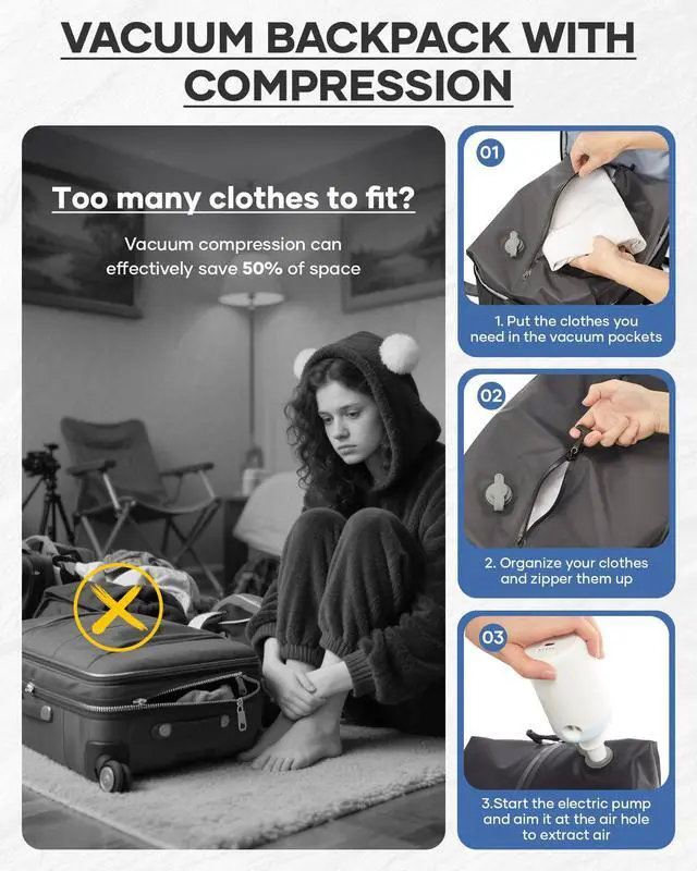 Air Travel Backpack: The size of this vacuum travel backpack is Height=47CM(18.5 INCH)*Width=33CM(12.99 INCH)*Length=20CM(7.87 INCH), which not only meets most airlines' maximum hand baggage size requirements and helps you save on check-in baggage fees, but also comes with a vacuum compression system that allows you to carry more clothes than ever before.
