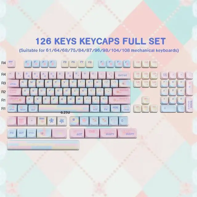 CompatibilityThe custom keycaps contains 166 keys, fit most 60%/65%/75%/80%/96%/100% (61/64/68/75/84/87/96/980/104/108) US layout mechanical keyboard