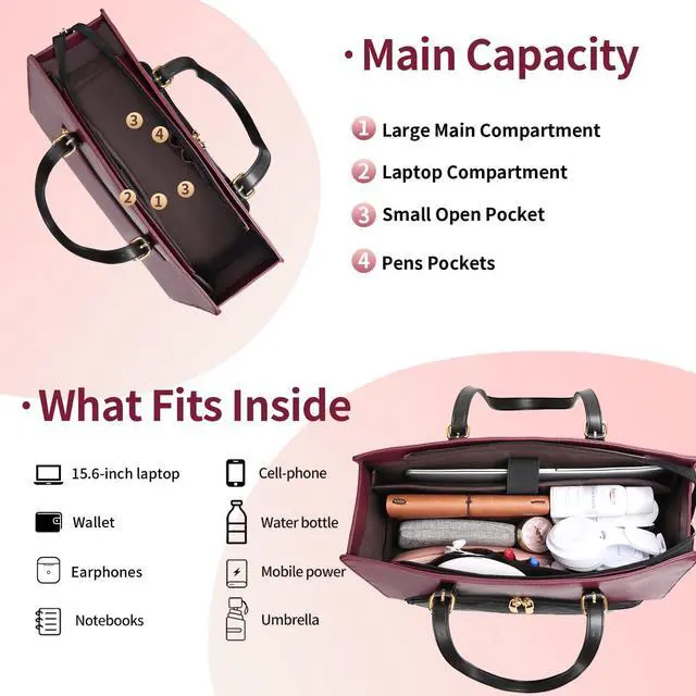 Versatility 15.6'' Laptop Bag: This leather tote bag with its size of 17.1" x 6.3" x 12.2"(L*W*H), presents ample space complemented by multiple compartments. The upper area of the cooler compartment can hold your laptop, charger, notebook and stationery. Specifically designed for the busy professional ladies, the laptop briefcase keeps everything organized and easily accessible. The adjustable handle spans a length from 8.6 to 11.8 inches, and the shoulder strap is from 28 to 49 inches.