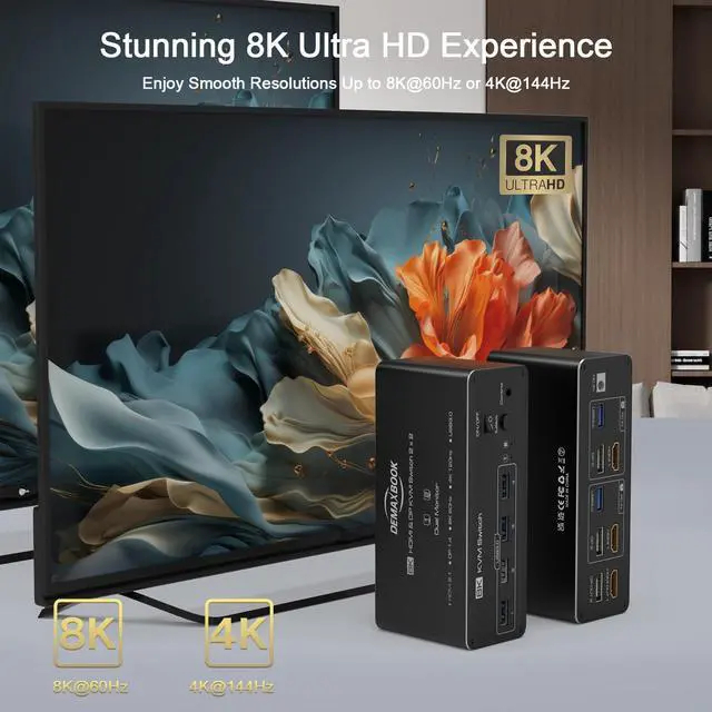 8K & 4K Ultra HD SupportThis Dual monitors HDMI2.1 + DP1.4 KVM switch supports 8K@60Hz and 4K@144Hz resolutions, providing crisp, high-quality visuals. Backward compatible with 4K@60Hz, 1080P, 2K, and 3D resolutions, it ensures stunning image quality across dual monitors.