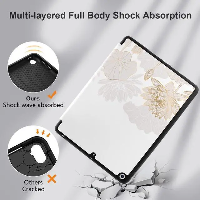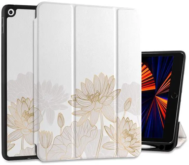 DONGKE Case Compatible with iPad 10.2 Inch 2021 2020 2019 iPad 9th/8th/7th Generation with Pencil Holder, Slim Stand Protective Case with Soft TPU Back, Auto Sleep/Wake Cover, Gold Lotus