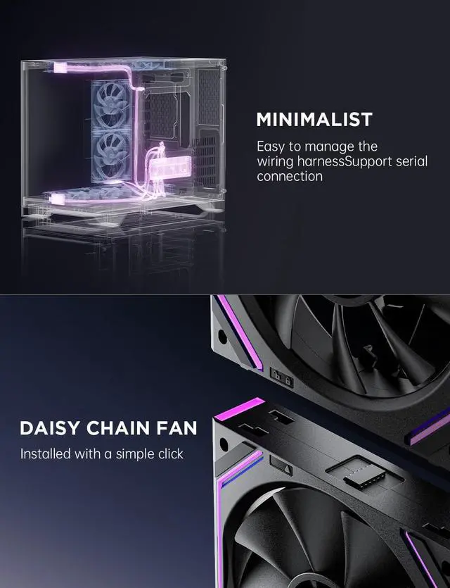 **Modular Connection & Simplified Cable Management** The DAWN 120mm features an innovative Modular Daisy Chain connection that reduces cable clutter by linking multiple fans with a single cable. This design ensures a clean and organized PC case interior. Easy-installation and modular structure make setup, maintenance, and repairs hassle-free.