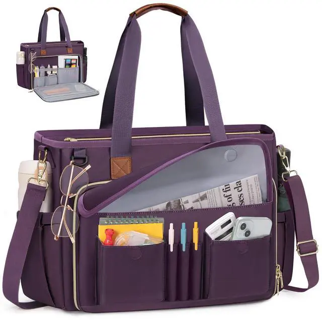 Multiple Pockets & Large Capacity Teacher Work Bag: Interior-The large main compartment of this teacher laptop bag with 4 inner pockets. Multiple External Pockets-1 large front zippered slip pocket with large mesh zippered slip pocket, with multiple pen holders, slip pockets for valuables such as mobile phones, chargers, keys, etc. 1 magnetic front flap pocket, 2 slip pockets, 3 pen holders, and 2 side pockets for water bottles, umbrellas, etc. 1 large magnetic pocket on the back panel
