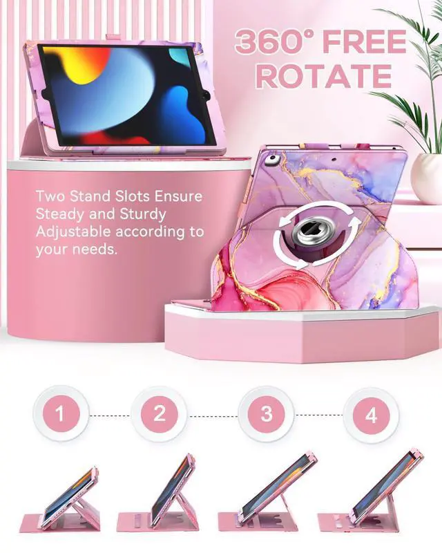 ZoneFoker Case for iPad 9th/ 8th/ 7th Generation, iPad 10.2 inch Case 2021/2020/ 2019, 360 Degree Rotating Stand, iPad 9 8 7 Gen 10.2 '' Leather Cover with Pocket Design & Pencil Holder, Marble Pink
