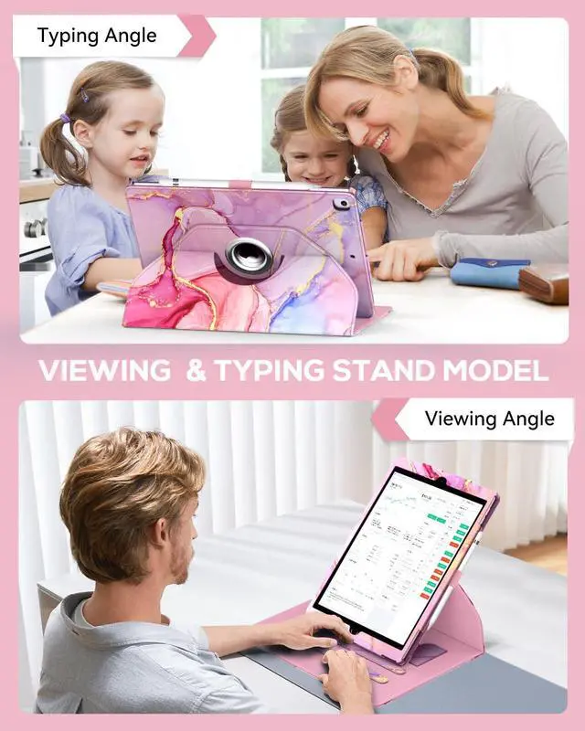 360 Degree Rotating: ZoneFoker case for iPad 9th 8th 7th gen are allowed swivel both vertically and horizontally; two non-slip grooves can set up multiple horizontal stand angles to reach your most comfortable viewing or typing