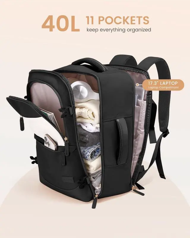 Ideal For 3-5 Day Trips: The 40L women's travel backpack is perfect for up to 5-day trips. The suitcase-style opening provides easy access at checkpoints. The carry on backpack features 11 pockets and 4 compartments to neatly store travel essentials, keeping everything organized.