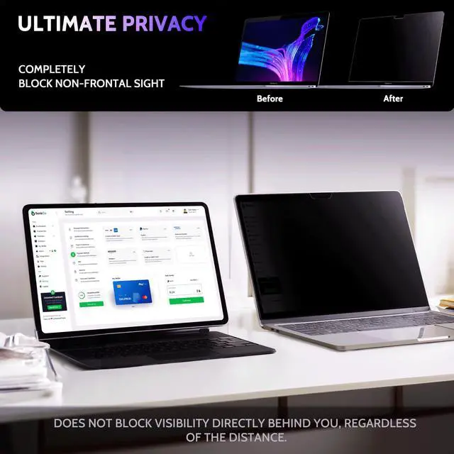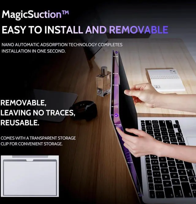 EASY TO INSTALLPeslv has innovatively designed a new installation method - MagicSuction. We designed nano-adsorption strips on the four sides of the MacBook Air privacy screen. Just align it with the MacBook screen frame and press it gently, and it can be installed in one second. With Peslv Privacy Screen MacBook Air 13 inch, you will never be in the embarrassing situation of not knowing how to install it!