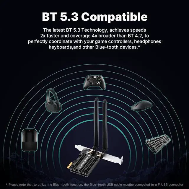 - & .Unlock the uncongested 6GHz band (160MHz channel) for interference-free performance, while Bluetooth 5.3 ensures ultra-low latency for headphones, controllers, and peripherals with LE Audio support