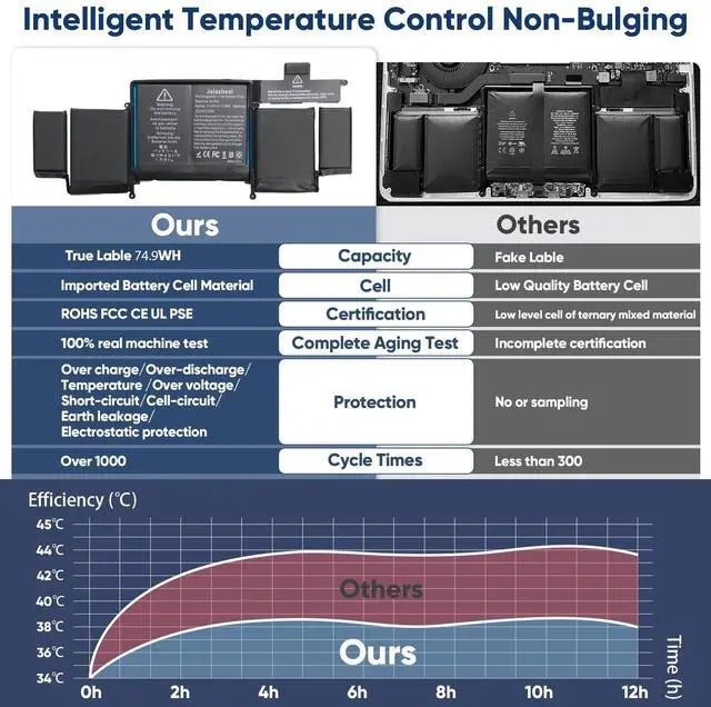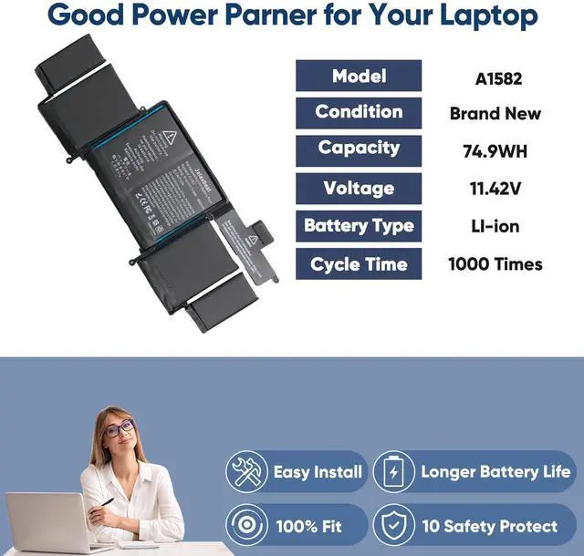6600mAh/74.9Wh High-Capacity Macbook Pro Battery A1502 A1582 macbook pro battery replacement has been rigorously tested for more than 1500 hours, with a capacity of 6600mAh, 11.42V, 74.9Wh, which lasts longer than the original battery and most A1582 batteries on the market, providing reliable power for daily use. 6600mAh/74.9Wh High-Capacity Macbook Pro Battery A1502 A1582 macbook pro battery replacement has been rigorously tested for more than 1500 hours, with a capacity of 6600mAh, 11.42V, 74.9Wh, which lasts longer than the original battery and most A1582 batteries on the market, providing reliable power for daily use.