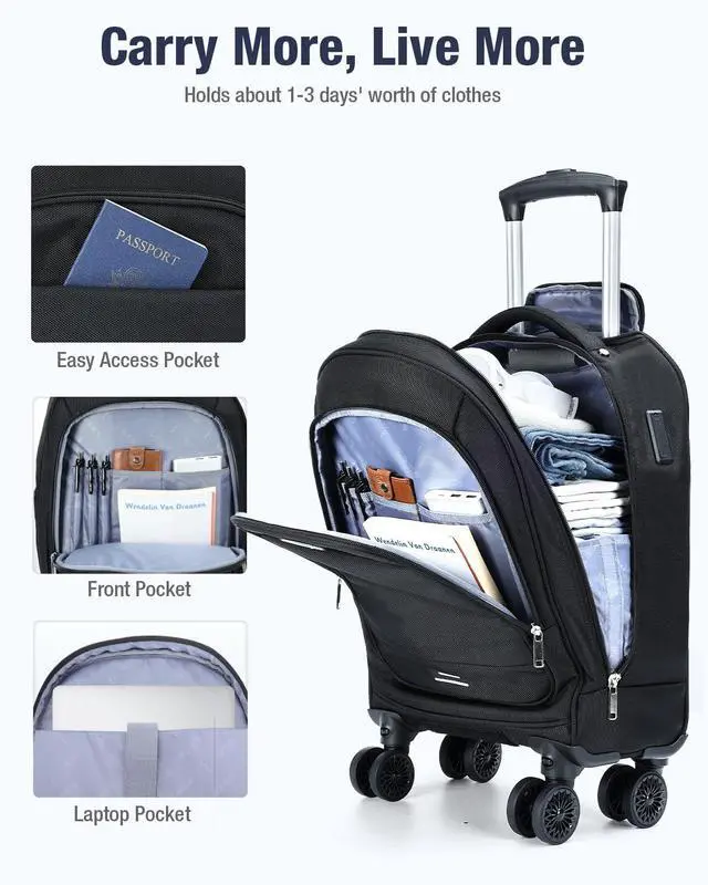 Smooth-Glide Spinner Wheels: 360° rotating wheels for effortless maneuvering through crowds, airports, or campus paths. Durable and quiet design ensures long-lasting use. Wheels are removable for easy transport and storage