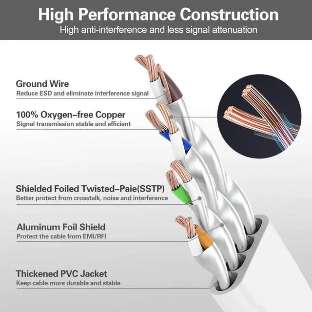 HiiPeak Cat 8 Ethernet Patch Cable is the latest and fastest Ethernet cable. Manufactured with 4-pair 28 AWG Oxygen-free copper, provides the best signal which transmitting can be up to 40Gbps.