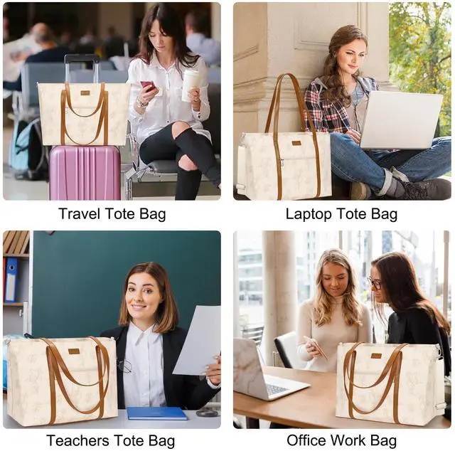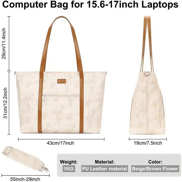 Teacher Tote Bag, Laptop Tote Bag for Women 17 Inch Laptop Bag Waterproof PU Leather Office Work Bag Business Briefcase with Compartment, Shoulder Straps (A3-Beige/Brown Flower, 17.3 inch)