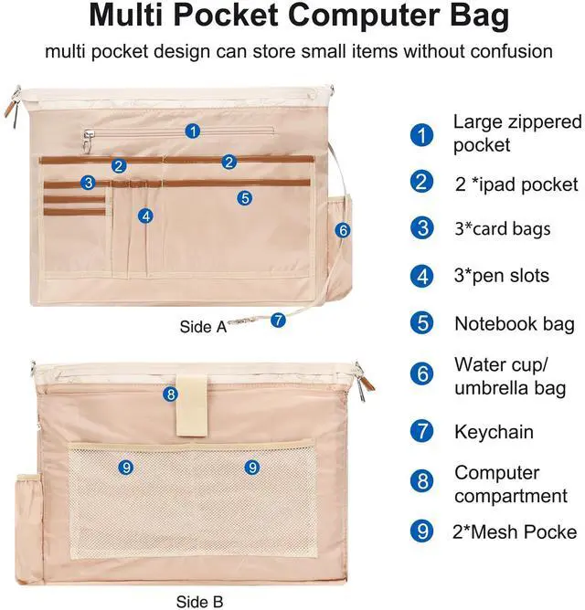 MULTI POCKET DESIGN LaptopTote Bag Stay effortlessly organized with 12 pockets! The front pocket has a zipper pocket, and the inner pocket has 1 * computer compartment+1 * large zipper pocket+3 * open pocket+3 * card pocket+3 * slot+2 * mesh bag+1 * water cup bag, Perfectly organize laptop, documents, makeup, and daily essentials.