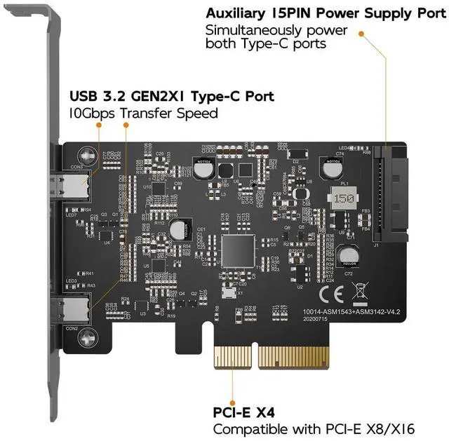 10Gbps High-Speed This PCIE to USB adapter features ASM3142 and ASM1543 chipsets, delivering high-speed and stable data transmission at up to 10Gbps through its dual USB 3.2 GEN 2 Type-C ports.