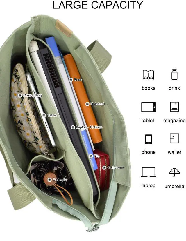 LARGE CAPACITYCrafted with heavy-duty 16oz canvas, this 16.5"Lx12.2"Hx6.3"W tote bag offers ample space for daily essentials. Features multiple inner pockets (including a laptop layer compartment) + a secure top zipper closure for organized, theft-resistant storage. Reinforced stitching ensures long-lasting durability. Suits maxi laptop size 15.6inch.