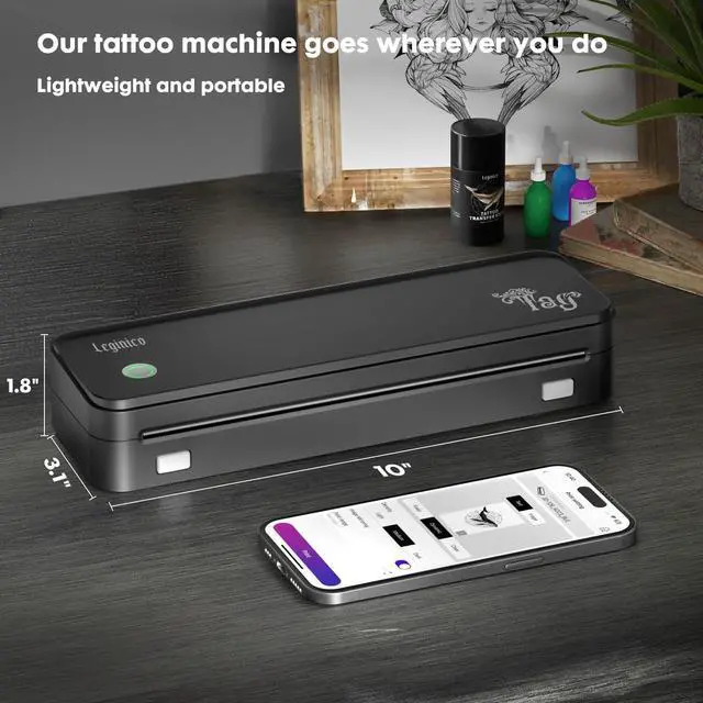 Compact & Wireless Tattoo Stencil Printer: At just 10.5x3.2x1.9 inches and 1.5 lbs, this portable tattoo printer machine is perfect for artists on the go. Wirelessly connect via Bluetooth to your mobile device for seamless, clutter-free design transfers.