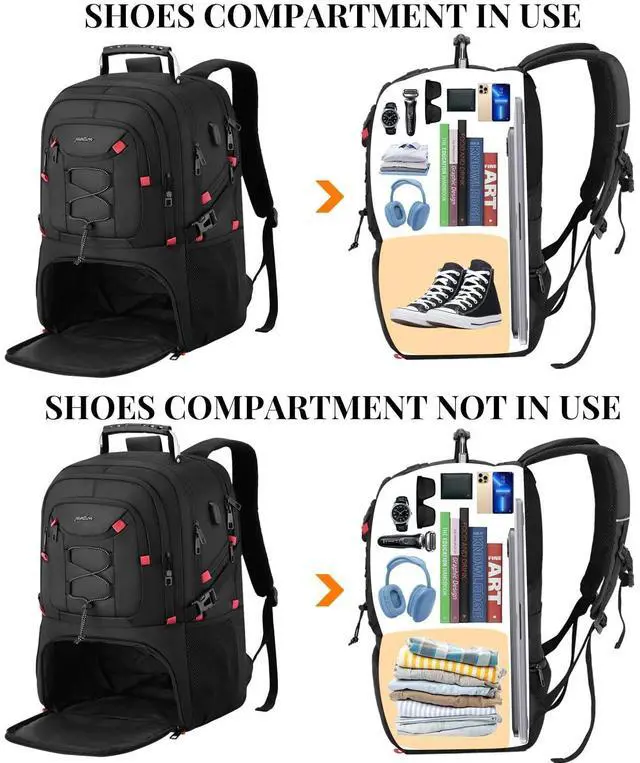 LARGE CAPACITY45L maximum capacity, the lightweight backpack with shoe compartment features independent laptop compartment with Five-layer protective sponge for 18.4in laptops, 1 main compartment for books,A4 folders and clothes. Front pockets for your daily supplies, 2 side pockets for umbrella or water bottle. It is convenient for a variety of applications, suitable for outdoor sports, weekend trips, work backpacks, school bags for teen boys.