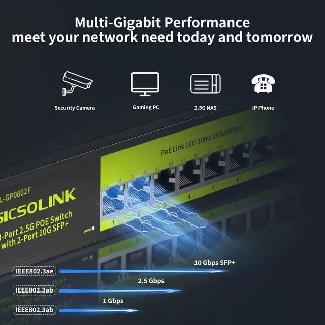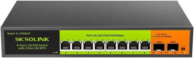High PerformanceThe 2.5Gbps Unmanaged switch with 8*100/1000/2.5Gbps Base-T POE+ Ports and 2*10 Gb SFP+ Ports, compliant with IEEE802.3 AF/AT standar, each poe port can supply up to Max.30W power,the total budget is 120W and have 80Gbps switching capacity to meet high-speed network needs.It can be easily used with 2.5G Gaming PCs, 2.5Gbps NAS and other devices.