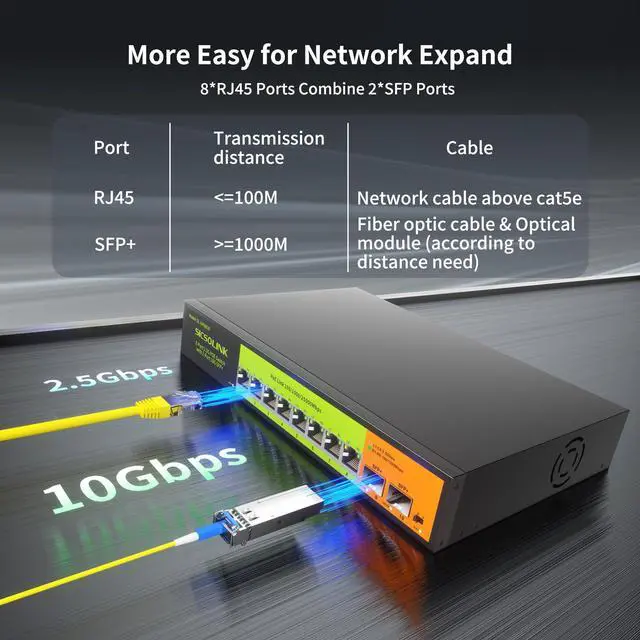 Wide Range of ApplicationsThe longest data transmission diatance of RJ45 ports is 100 meters, but for SFP+ Ports, it can transmission at least 5km, and can transfer event more longer depends on the fiber module and optial cable.The switch combine both RJ45 ports and SFP ports, make it meet both short and long distance need, has wide range of applications, more easy for you to