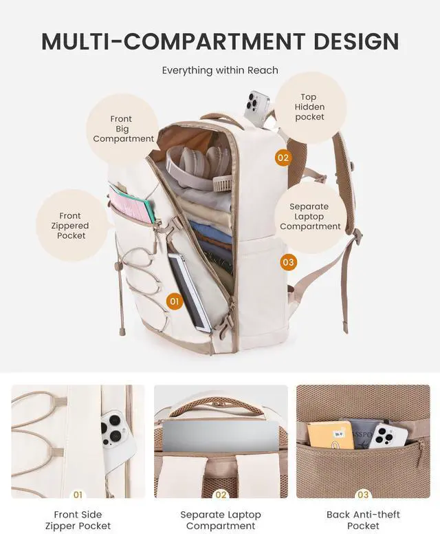 LOVEVOOK Travel Backpack for Woman Men:The external elastic drawstring design can be used to secure temporary items such as coats, wet umbrellas, and towels.This travel bag blends fashion and functionality seamlessly, enhancing your travel style for urban trips or outdoor adventures