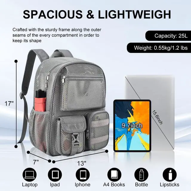 Mesh Backpack for School, 25L Large Heavy Duty mesh backpacks for Adults Girls Boys Kids with Inner Laptop Compartment, mesh Schoolbag for Outdoor Hiking Beach(Gray, Small)