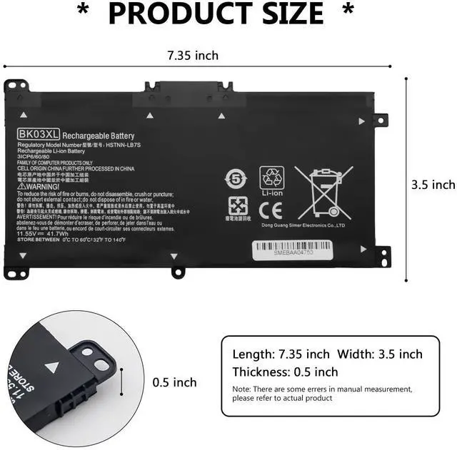 Specification:Voltage:11.55V.Capacity: 41.7WH.Color: Black.Condition: 100% new from manufacturers.Package Includes:1x BK03XL Laptop Battery,2 x Free Screwdrivers, and 2 x plastic sheets for HP Laptop Battery.We will offer 12 months warranty. If you have any questions or concerns,we will respond within 24*7 hours via emails and give you friendly after-sales service.
