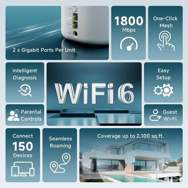 - : Covers up to 2,100 sq. ft. with ultra-stable WiFi. More space? Just add more nodes. Seamless Wi-Fi 6 blankets your house, eliminating dead zones and interruptions. A better solution than standard WiFi boosters and extenders