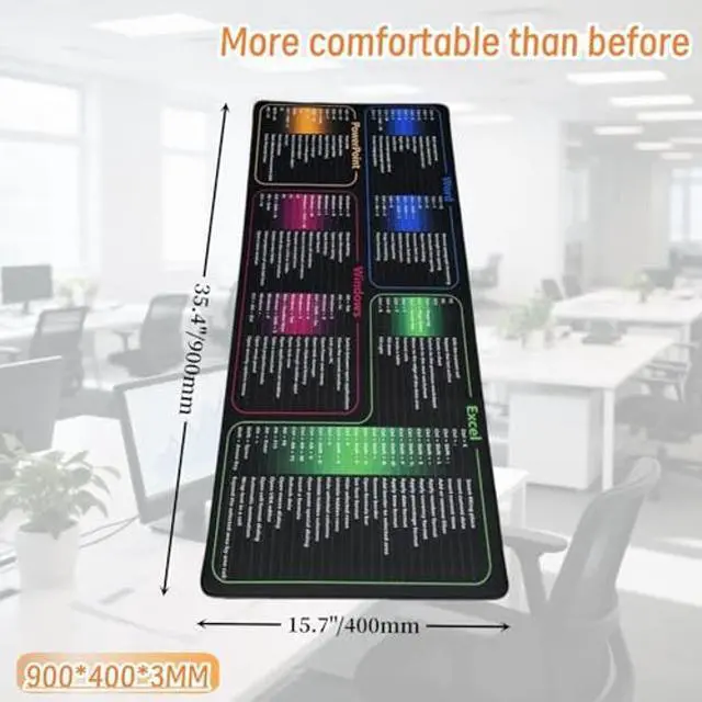 XXL All-in-One WorkspaceFits keyboard + mouse on this 35.4"x15.7" excel mouse pad (900x400mm). 3MM cushion supports wrists during extended office/gaming/design sessions