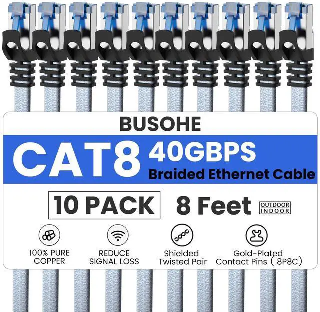 40Gbps 2000Mhz Ethernet Cable : 8FT 10-Pack CAT8 shielded ethernet cable supports up to 40 Gigabit per second data transmission speed and 2000MHz bandwidth, connect to LAN/WAN segments and networking gear at maximum speeds