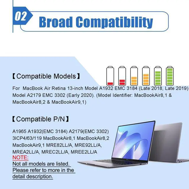 Compatible Laptop ModelsFit for MacBook Air Retina 13-inch Model A1932 EMC 3184 (Late 2018, Late 2019), Model A2179 EMC 3302 (Early 2020). (Model Identifier: MacBookAir8,1 & MacBookAir8,2 & MacBookAir9,1)