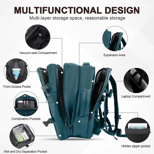 Multi-functional Compartments This vacuum seal backpack includes 8 compartments and pockets, such as 2 front pockets, dry/wet separation pocket, vacuum-seal compartment, expandable area, 2 internal zipper pockets, laptop compartment (fits up to 17'')