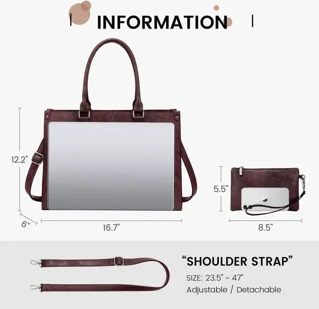 What You Will Get: 1 x 15.6 -inch laptop tote bag 1 x Small, charming clutch purse 1 x Detachable, adjustable shoulder strap