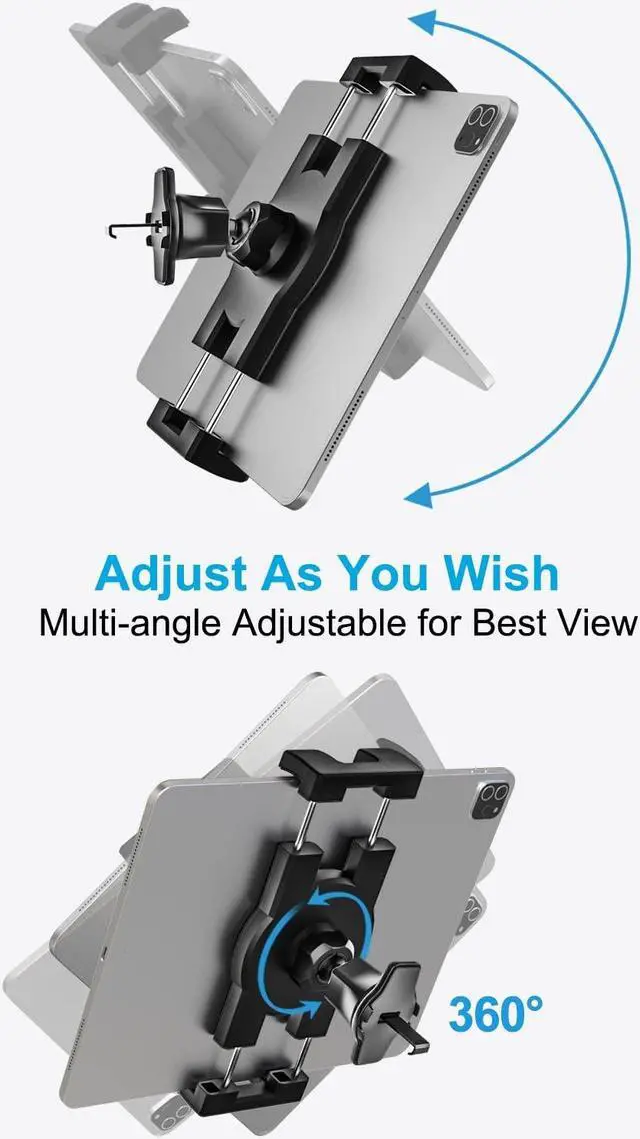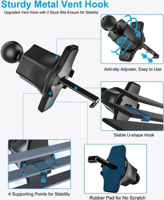 Never Fall Off U-Shape Hook The car vent tablet mount is designed as "U-Shape Hook" that can grip your vent blade tightly and ensure it never fall off in any situation. Plus, our vent clip hook is made of metal material, which essentially resolves the car tablet holder vent clip fracture issue. Say goodbye to all the insecurities, enjoy your driving.