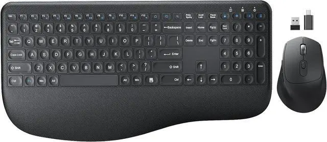COMFORTABLE WRIST REST Ergonomic keyboard designed with a generous palm rest and adjustable tilt feet, offers a better typing position to reduce the pressure on your wrist. The wireless mouse provides total comfort with a perfect handshake angle, contoured grips and premium matte finish.