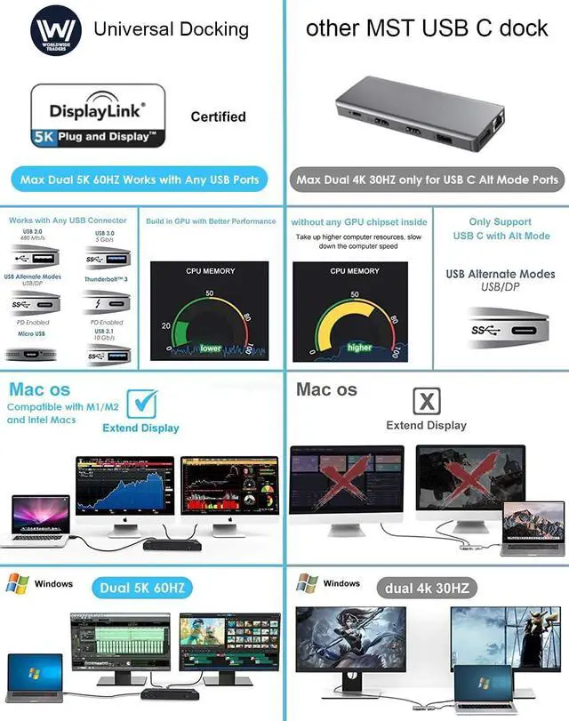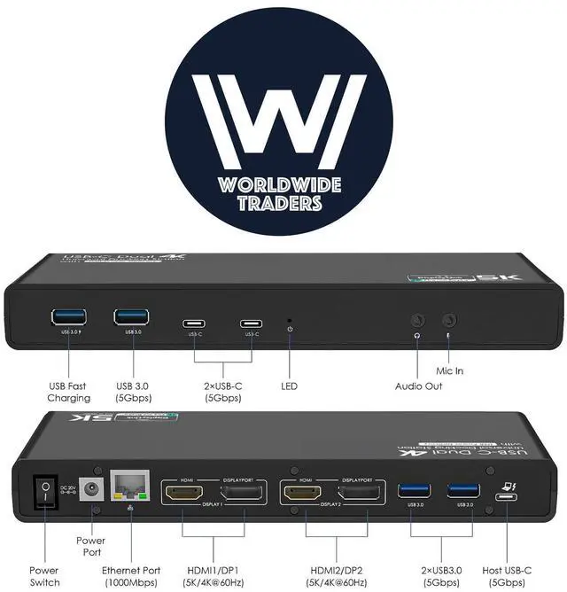 Product Description Power your desk the easy way. The WorldWideTraders Universal USB-C Dock turns a single laptop port into a full workstationdual 4K@60Hz displays, six high-speed USB 3.0 ports, and rock-solid Gigabit Ethernet. A 100W power supply feeds the dock while up to 65W charges your laptop through USB-C, so your battery stays topped up while you run multiple monitors and peripherals. With broad OS support (Windows, macOS, ChromeOS, Ubuntu) and flexible video2× DP and 2× HDM
